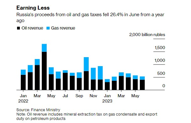 由于原油價格下跌和歐洲天然氣供應受限,俄羅斯上月油氣收入縮水逾四分之一。俄羅斯財政部表示,6月來自石油和天然氣稅的預算收入同比下降26%,至約5290億盧布(合58.4億美元)。其中,天然氣稅的預算收入下降了54%,至1257億盧布,而原油和石油產(chǎn)品的收入(占碳氫化合物收入的76%以上)下降了近十分之一,至4028億盧布。